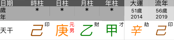 除了日主,剩下的五行排列就是乙和辛,那就是辛金剋乙木,乙木對日主庚金來說是財,所以可以判斷財運變弱了。